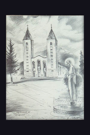 Disegno a carboncino di San Giacomo e statua antistante la chiesa
