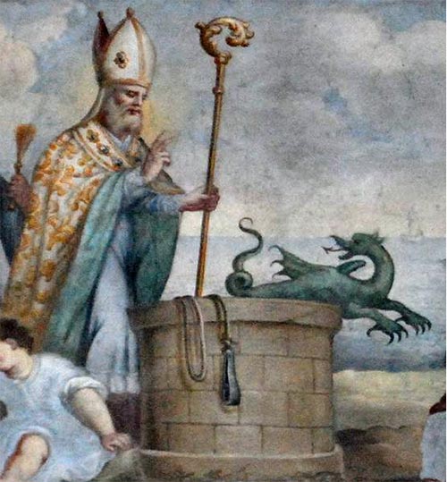 E' forse un riferimento alla lotta ingaggiata dal santo per combattere l'eresia ariana, personificata nell'orrendo animale. Di questo fatto, esiste ancora una lapide marmorea (1580) che ritrae san Siro nell'atto di sottomettere il serpente basilisco.
