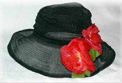 Vicino al tavolino, una sedia a dondolo, la struttura nera come il tavolo - paglia di Vienna grezza per lo schienale ed il sedile su cui é adagiato in una posa un pò stereotipata, un manichino di plastica dura e lattea, senza volto. Sui capelli appena un'onda accennata, un cappello di velluto rosso bordeaux con una veletta.