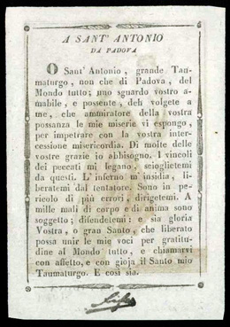 "Verso la metà di maggio del 1894 una signora si trovava nella carrozza d'un treno in compagnia di altri viaggiatori. Eran passate quattro ore dalla partenza, quando la signora si accorse d'aver smarrito il biglietto di viaggio: e avendola aiutata nelle ricerche quanti erano nella stessa carrozza, ne rovistarono ogni cantuccio; ma inutilmente. "Sant'Antonio trovatelo voi!" — esclamò con vero slancio di fede la pia signora. Scoppia un'ilarità irrefrenabile a queste parole ed uno di quegli increduli viaggiatori si permette di aggiungere: "Sicuro! Signora, Sant'Antonio glielo rimanderà da uno dei finestrini!" La buona signora tutta mortificata da questo lazzo, vergognosa d'aver esposta agli scherni di quegli increduli la fede che aveva nel Santo, crede bene di tacere, fa la sua promessa e prega il Santo in cuor suo. Dopo qualche minuto il treno si ferma ad una stazione, e poco dopo, ripreso il cammino, ecco si presenta allo sportello uno dei verificatori, montando sulla predella della carrozza. Al vederlo la signora più che mai si smarrisce, cerca per l'ultima volta il suo biglietto, essendo per lei gravosissimo di doverlo ripagare. Uno di quei viaggiatori dice: "E' proprio inutile, Signora, lei non ha il suo biglietto, lo sa benissimo che lo ha perduto!" A queste parole, dette tra le risa generali e villane, il verificatore soggiunse: "Lei ha perduto il suo biglietto? Per quale destinazione?" - la signora gli nomina la città - "Ebbene, stia tranquilla: il suo biglietto è stato trovato sul marciapiede della stazione di partenza: ho ricevuto a quest'ultima fermata un telegramma che me ne avvisa." E senz'altro le porse dal finestrino un foglio di riscontro che sostituiva il biglietto. La buona signora ringrazia con effusione il verificatore, e, rivolgendosi a quello dei viaggiatori che alla sua incredulità aveva aggiunto il sarcasmo gli dice: "Lei l'ha indovinata: Sant'Antonio mi ha rimandato il biglietto dalla finestra!!".